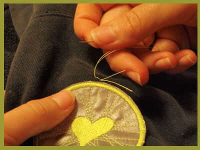 Para evitar el desmoronamiento, fije la primera puntada con una "tachuela trasera": insertar la aguja en prenda base. Pop, haciendo sobre una puntada larga de 1/8". Tire del hilo a través de lentamente, dejando aproximadamente una 1/2 cola.