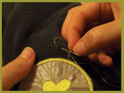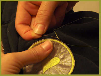 Vuelva a insertar la aguja en el mismo agujero que usted comenzó con. Pop detrás por el mismo agujero. {Vaya lento, precisión cuenta}. Tire del hilo a través, manteniendo la cola seguro.