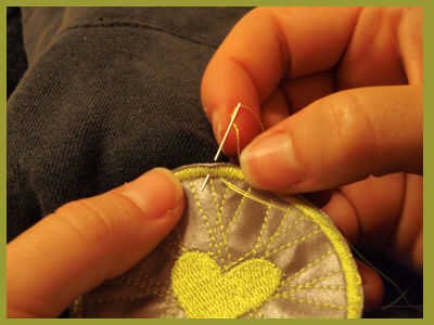 Continuar cosiendo alrededor de la circunferencia del parche. Mantener tus puntadas espaciadas uniformemente y bastante juntitas.  Acabado con otro "rumbo posterior" {ver paso 2} a través de la parte trasera de la prenda base.