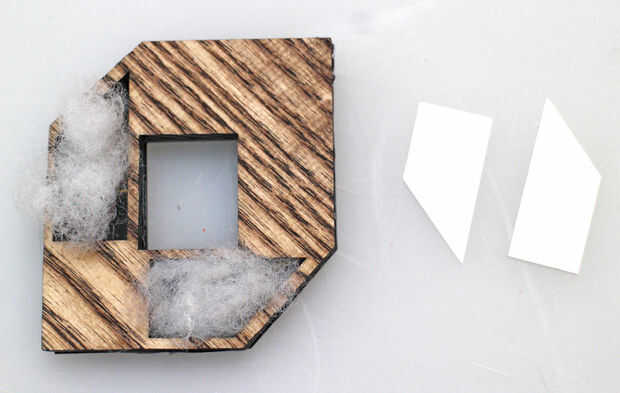 Tome algunos relleno fibra de poliéster y materia en las cavidades con los LEDs de la parte delantera, esto ayudará un poco con la difusión de la luz. Las piezas de acrílico blanco en lugar de pop, esto puede tomar algo de trabajo. Debe haber cierta tensión, pero tenga cuidado de no forzarlos demasiado o puede romper la madera. Pruebe los otros tamaños usted cortar o lijar una cara o dos abajo utilizando un trozo de arena de papel sobre una superficie plana y vuelva a intentarlo.