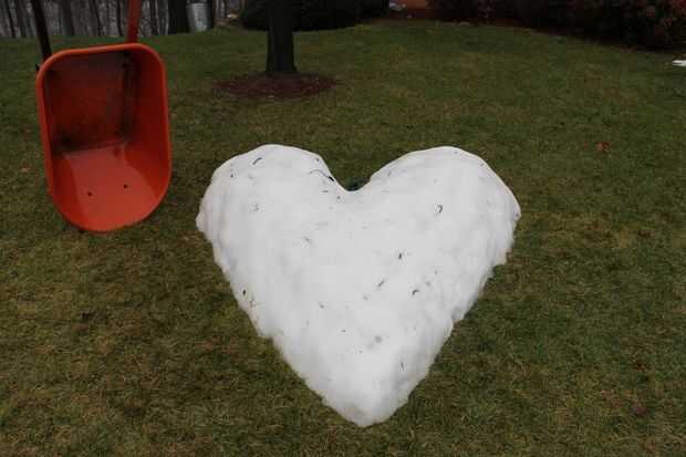 Para este proyecto, se utilizó una carretilla para transportar nieve de la nieve unmelted restante de Snowzilla montones a lo largo de la calzada. Un aproximado todo el 6-pies por 7 pies alto corazón fue ideado en la nieve. Tiene una ligera inclinación hacia adelante, siendo de 2 pies alto en la parte trasera y alta de 1 pie en el punto anterior.