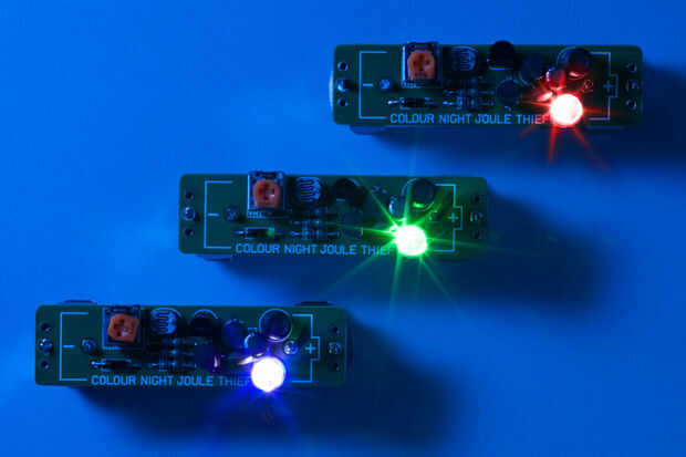 Así combina el LED multicolor y Joule Thief en uno y tiene a color noche Joule Thief. Es una versión de la lámpara de estado de ánimo de noche Joule Thief.