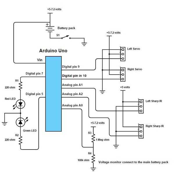 He añadido bastantes características con sólo unos pocos componentes. Te sugiero conseguir un botón como un botón de pausa. Necesita un resistor para el botón de conexión a un puerto de E/S digital abierto. Para los servos necesita fuente de alimentación mediante la batería positiva y negativa. Use 3 cabeceras de pin en el escudo para que tenga un lugar para conectar el servo. Luego conectar el control a un puerto PWM de Arduino. Ahora he utilizado una mala práctica de la semi, como apuntan a los servos de la batería y no aunque un regulador de voltaje o un convertidor DC a DC. Si usted es capaz de tratar y suministrar los servos con una alimentación separada de 5-6 voltios. He relacionado algunos sitios abajo para guiarte con la adición de elementos al escudo. Para el monitor de voltaje LED usé un LED bicolor.