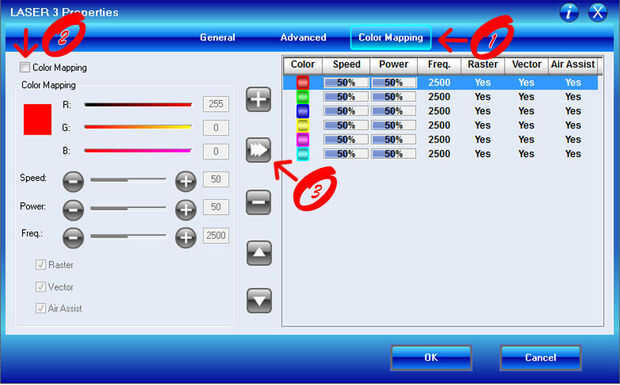 Por favor tenga en cuenta que el color real de la línea es lo que importa y no la capa que es la línea. Una vez que el archivo está listo para ir, "Imprimir" y entra en el menú de "Propiedades" para la configuración de Epilog. En lugar de la ficha "General" van a la pestaña "Color Mapping" en la parte superior [1]. Marque la casilla para habilitar la asignación de Color [2]. Usted verá las seis RGBYMC color opciones básicas ya están disponibles. Usted puede agregar sus propios colores específicos, pero el valor numérico o su línea de trabajo debe coincidir exactamente con el menú de impresión (no intente adivinar o solo los ojos), por lo tanto, por qué los valores por defecto se recomienda el uso. Ajustar la velocidad / potencia / frecuencia como normal para cada correlación color y golpear la flecha aplicar [3].