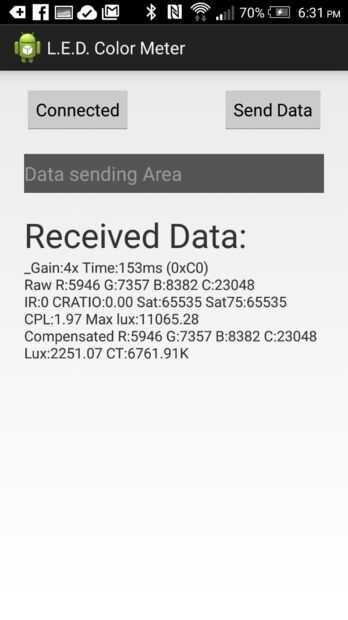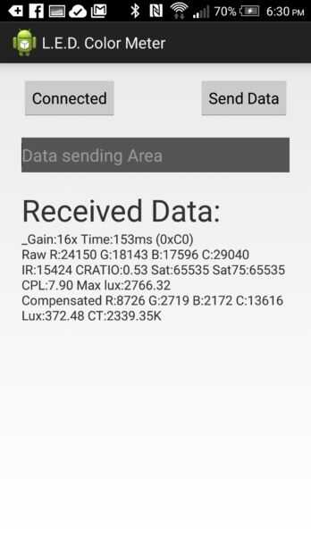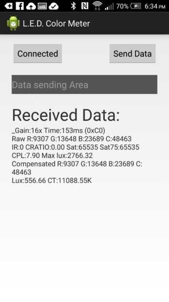 La aplicación para android es solo el ejemplo aplicación Android para la placa Arduino Bluetooth. La aplicación funciona más como una prueba de concepto en esta etapa. Sólo añadí un caracter de marcador en el código de Arduino para que la aplicación de Android podría despejar la pantalla en lugar de agregar al registro. Como se puede ver diferentes fuentes de luz dan las lecturas correspondientes.