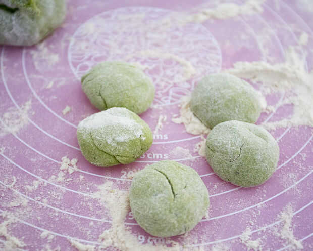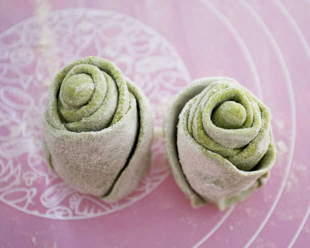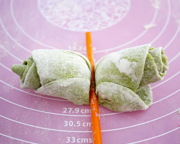 primero hacer 8 bolas de doh juego rosa y aplanar hacia fueraA continuación añadirlos todos juntosHacer 2 bolitas verdes y aplanar hacia fueraLuego darles forma en una hojaLuego atarlos juntos