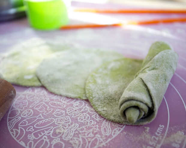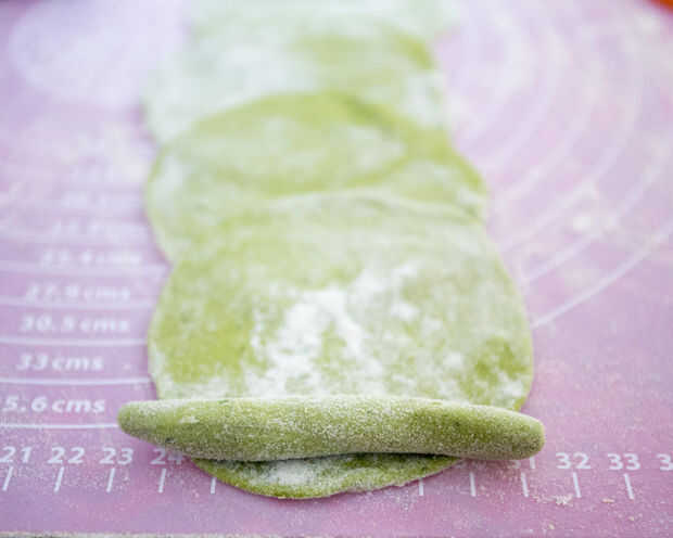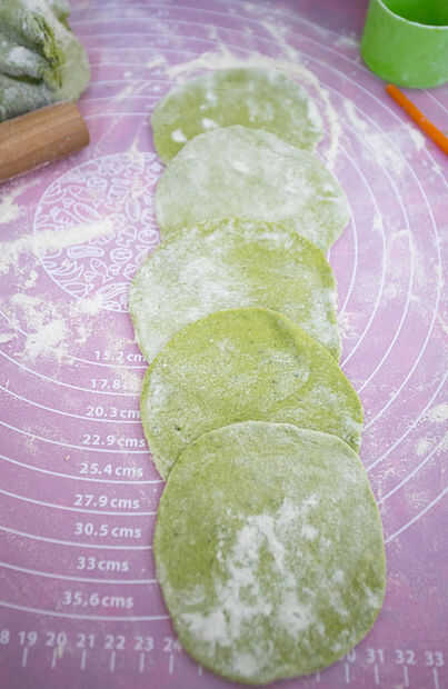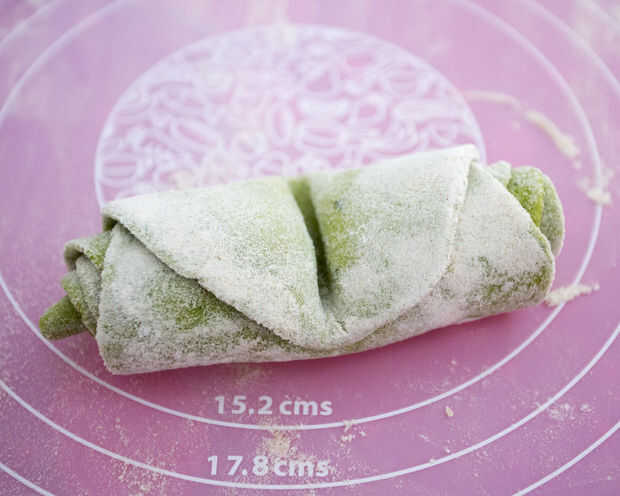 Haz 5 pequeñas masas, hacerlas rodar, poner uno en el otro. Además de una masa extra para hacer el centro de la flor. hacerlas rodar, cortar 2 piezas. Ahora has hecho el paso base.