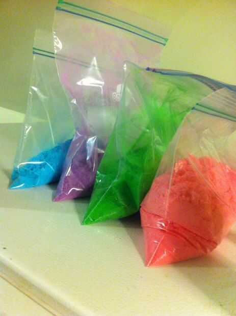 1 taza almidón de maíz + media taza de agua crea una extraña sustancia llamada oobleck, que tiene propiedades de la materia líquida y sólida. Utilizar un procesador de alimentos fuerte para mezclarlo (te a luchar), luego agregar un tubo entero de colorante, extenderlo en una bandeja y dejarlo secar durante 2-3 días. Para más secar, precalentar el horno a 350, apague el horno (muy importante) y lugar restos crepitante, seco, coloreado en el horno durante 10-20 minutos. Use una varita mágica o un dispositivo similar para pulverizar en polvo. Guardar en bolsas de cierre hasta que se necesite. Almidón de maíz fue de $1,25. Una pequeña caja era suficiente para 3 colores (3 tazas), que pueden cubrir fácilmente una familia de 4-5. El colorante que ya teníamos.