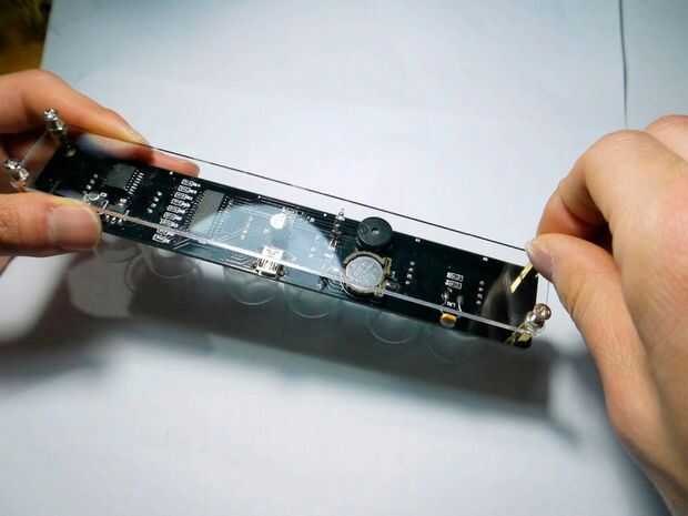 Fnish el reloj, darle la vuelta e Inserte la batería (el + de la pila se enfrenta hacia fuera), entonces ft la cubierta inferior de acrílico y fx en lugar con los cuatro tornillos largos. Enrosque una tuerca en cada tornillo a medio camino a lo largo del tornillo, luego cada tornillo en su lugar varias vueltas y luego suavemente apriete la tuerca sobre el acrílico. Esto mantiene la tapa en su sitio y proporciona cuatro pies ajustables para el reloj. Asegúrese de que los cuatro tornillos están sobresaliendo la misma cantidad y que el reloj encuentra grasa sobre sus "pies". Asegúrese de quitar el flm protector de acrílico.