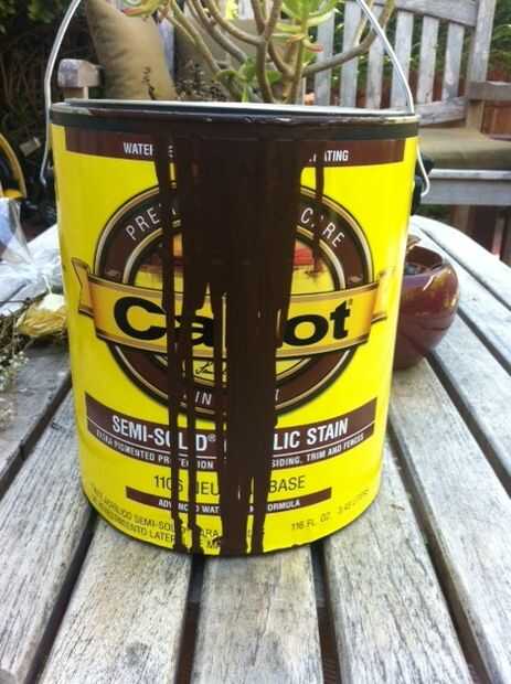 Elegir el tinte adecuado es importante. Voy con pintura semi-sólida Cabot a base de agua. ¿Por qué? Se seca rápidamente, limpia para arriba rápidamente y el semisólido esconde algunos de los rasguños en la madera - gracias a Buckley y sus garras.