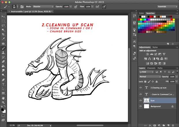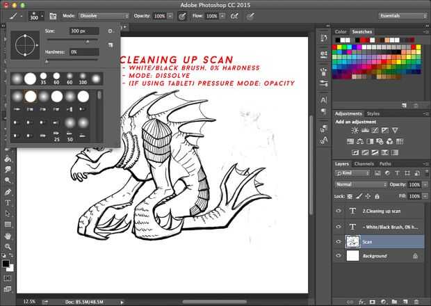 A pesar de niveles ha conseguido librarse de la mayoría de la decoloración, suele haber unas cuantas líneas y "imágenes fantasma" aún visible. Para solucionar este problema, utilizar la herramienta pincel y, si usted tiene uno, una tableta. Yo uso una Wacom Intous, que son bastante baratos y de lujo no en todos. Como un artista zurdo, fácil de usar la herramienta pincel con mi mano izquierda la pluma entonces un ratón derecho. La herramienta pincel es un defecto de la fila superior, con la dureza en 0%. Puede ensuciar con la dureza a lo que usted prefiere. El modo de cepillo es disolver (situado de la caja del cepillo), que ayuda a simula la textura de un lápiz. Varían entre opacidad o tamaño presión de pluma, que se encuentran en la parte superior de la barra (el círculo con un lápiz de tocarla).