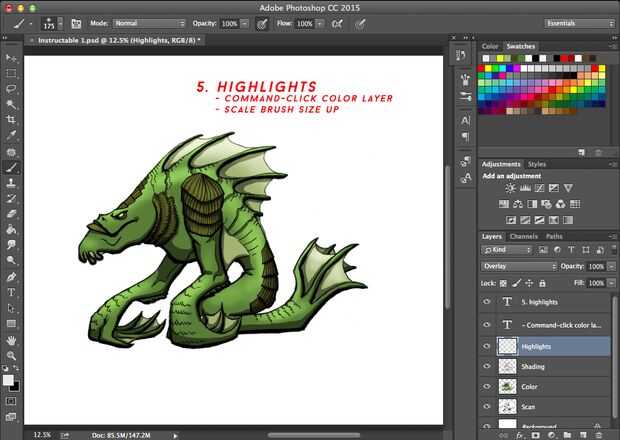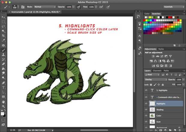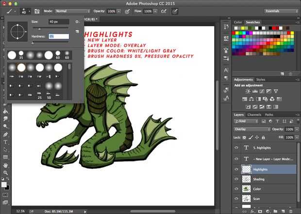 Para destacados, utilizar un cepillo suave y una luz más general. Seleccionar la capa de color ya que utilizo el cepillo más suave en los bordes de la obra de arte, y la selección ayuda a prevenir el color dejando la obra y se derrame sobre el fondo, que podría ser problemático si usted decide el fondo de color. Como multiplicación, superposición hace un buen trabajo de preservar los colores debajo y te ahorra tiempo de conmutación a los diferentes tonos. Si el recubrimiento no gustos, dude ensuciar con sus opacidades y otros modos de fusión de capa.