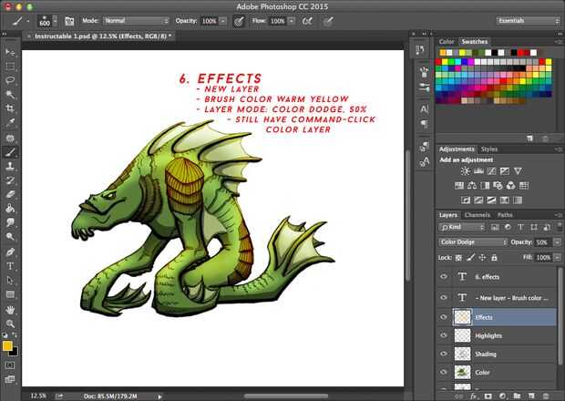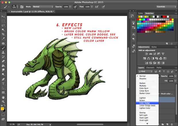 Los efectos son donde su imaginación puede ir salvaje! Color Dodge es un interesante modo de fusión, y lo recomendaría fastidiando con otros colores además de cálidos amarillos y otros modos de fusión y su opacidad.