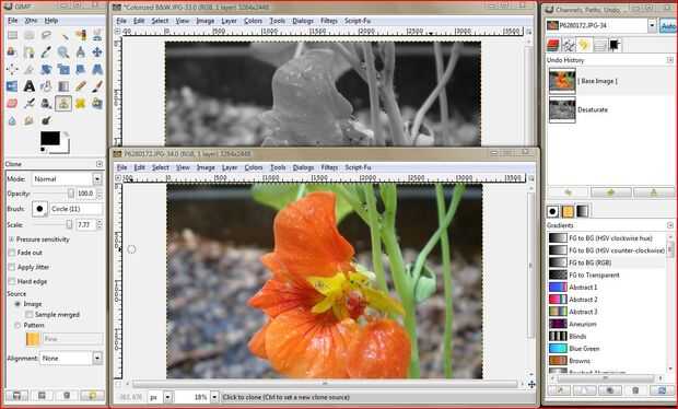 Ahora abrir otra copia de la misma foto. Tienes dos fotos abiertas, una en blanco y negro y otra de la misma foto en color. Debe guardar esta foto como "flowercolor". De esta manera nos aseguramos de que el original sigue siendo sin modificar.