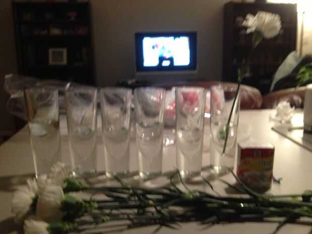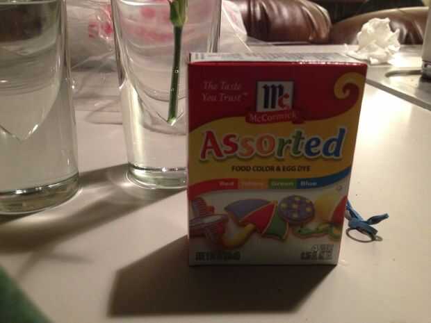 -tazas - agua caliente - colorante alimentario de forma líquida (yo usé McCormick con rojo, amarillo, verde y azul) - flores blancas (usé claveles pero cualquier Gould trabajar - tijeras - pequeño cuchillo (opcional) - paciencia-el tiempo - algo para configurar el SAI, como una caja, para contadores no te manchas en ellos