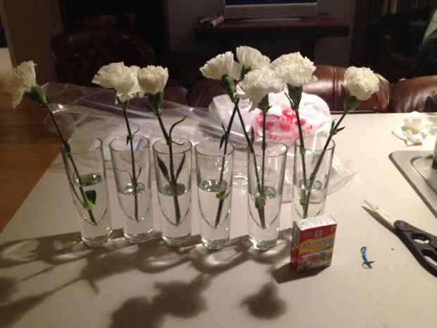 Por lo tanto, lo primero que hice fue cortar las flores en diagonal y pegar con agua tibia. El agua caliente se supone para ayudar a las flores a tomar agua más fácilmente.