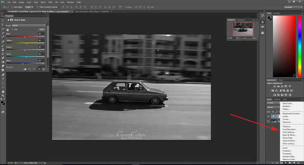Después de seleccionar el icono de capas, aparece una variedad de opciones. Para este proceso, vamos a añadir dos capas: blanco y negro y tono/saturación. La opción blanco y negro agrega una capa de blanco y negro de la imagen, pero no alterar la imagen original. La opción tono/saturación permite ajustar la luminosidad, el tono y la saturación de la imagen (a través de barras de control deslizante) a tu gusto sin alterar la imagen original. Para conseguir la luminosidad deseada, tono y saturación, experimentando con cada control deslizante puede ser necesaria.