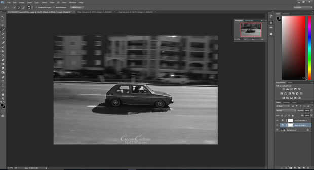 Una vez el relleno adecuado, es hora de cambiar el color al tema de la imagen. Para comenzar este proceso, haga clic en el objeto que desee colorear (en este caso el coche) con la herramienta de selección rápida. Puede ser necesario hacer clic en varias partes de la imagen antes de que la herramienta de selección rápida selecciona al tema deseado completamente. Cuando esto esté hecho, convertido en se expuso el tema de la imagen en una línea de puntos.