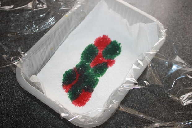 Poner una capa de papel de aluminio se aferran en la bandeja de plástico, añadir una capa de papel de cocina y gotas o rayas con colorante en la misma.