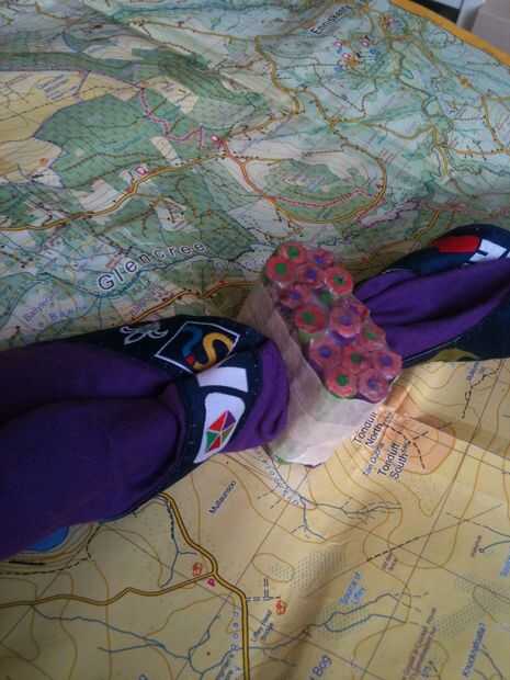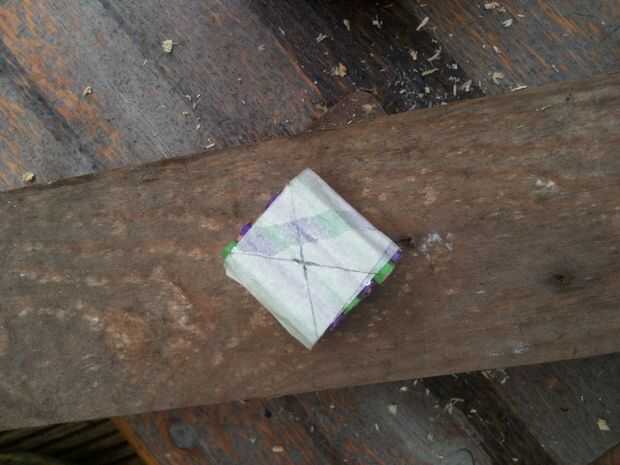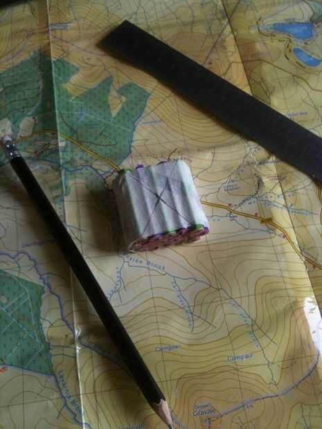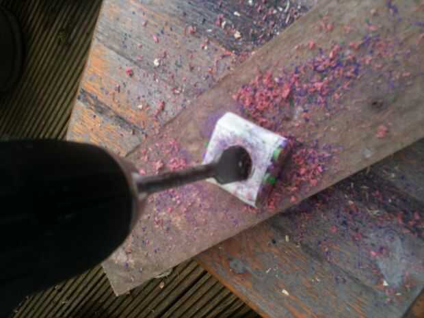 Mientras espera, puede perforar un agujero de prueba en un pedacito de madera de desecho. Probar con su pañoleta en agujeros de diferentes tamaños para ver cual se adapta (estoy usando una broca de 20mm). Cuando el pegamento se haya secado debe marcar el centro de tu blanco. Cuando esté satisfecho con sus medidas (medida dos veces, corte una vez!), use un compás para dibujar un círculo, 27mm de diámetro (el tamaño de la woggle acabado). Coloque el blanco en madera y una 20mm agujero a través del centro del taladro. Perforé a través hasta que la broca sólo rompió la superficie trasera, luego lo volcó y terminó el hoyo (prevención de 'escape'). En esta etapa usted puede comprobar si se ajusta a tu pañuelo para el cuello la a través del orificio.