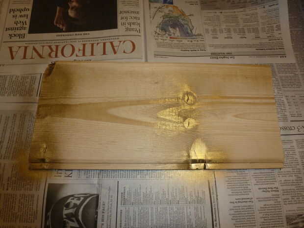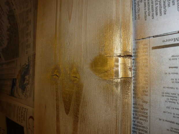 1 color: Usé pintura en aerosol oro para resaltar características inusuales en la madera y nudos. No tarda mucho, y cuando vaya a rociar los nudos encontrará que ya que son la parte más densa de la madera no absorba mucha pintura. Sólo un ligero rociado en algunas características es todo lo que necesita. No te preocupes si se pone demasiado en como este es el primero de los tres colores de pintura. Usted puede minimizar el aspecto si terminan siendo un poco demasiado pesado entregado. Que este seco.