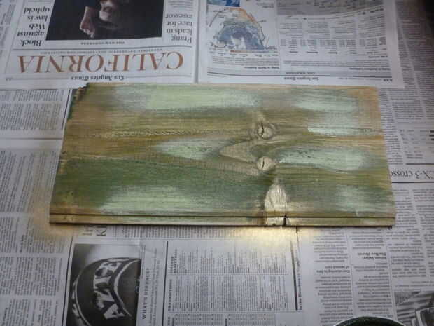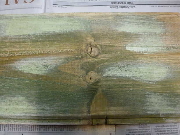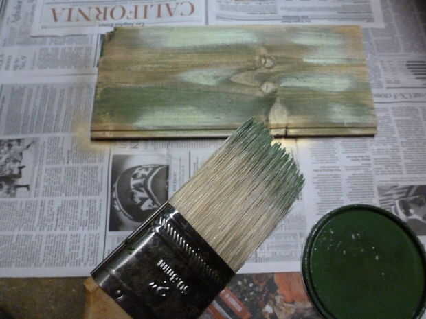 3 color: El color primario irá en pasado. Utilicé una mancha verde de madera y los galones que compré era más que suficiente para que la habitación que hice. Con un cepillo diferente, ligeramente cargar el cepillo y luego la dab en algunos puntos. Yo solía poner los colores finales en los lugares donde menos de los colores anteriores había ido y entonces como el pincel secado, mezcla el color 3 º en las capas originales. Seguir con la dirección de la veta. La mancha es mucho más delgada que la pintura de látex y de flujo (y goteo!) mucho más. Ser conscientes de esta diferencia e ir ligeramente. Esta es otra oportunidad para resaltar los patrones de grano de la madera o de otras irregularidades naturales. ¿Demasiado color después de este paso? ¿Recordar el papel de lija tenes? Si usted realmente fue por la borda en un lugar, seguir adelante y lo de la arena. Puesto que estamos buscando una mirada resistida, tales irregularidades son en carácter.