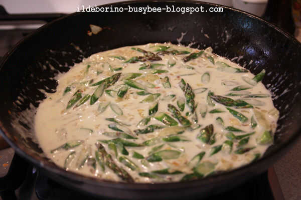 Poner algo de agua en una olla grande y el calor. Calentar el aceite y la mantequilla en una sartén grande. Finamente, cortar la cebolla y cortar los tallos de espárragos diagonalmente para obtener rodajas finas. Poner la cebolla y tallos de espárragos en la sartén y cocinar durante unos 8-10 minutos o hasta que esté dorada la cebolla y los espárragos se empieza a ablandar. Añadir las cabezas de espárragos, una pizca de pimienta negra recién molida, sal y cocine durante unos minutos. Añadir sal gruesa al agua de la pasta cuando arranque el hervor y cocinar tus tallarines en él. Añadir la nata a la mezcla de espárragos y la cebolla y deje reducir a fuego medio alto hasta que obtengas una salsa espesa.