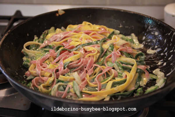 Picar las hierbas. Drenar los tagliatelle al dente, reservar algunos del agua de cocción. Verter los tallarines en el ápice de la cacerola la salsa, añadir las hierbas y saltear durante unos minutos, agregar el agua reservado si la pasta queda demasiado seca. Poner alguna pasta en un plato, espolvorear con unos granos de pimienta rosa que se estrelló entre los dedos y servir.