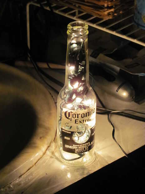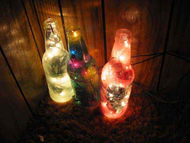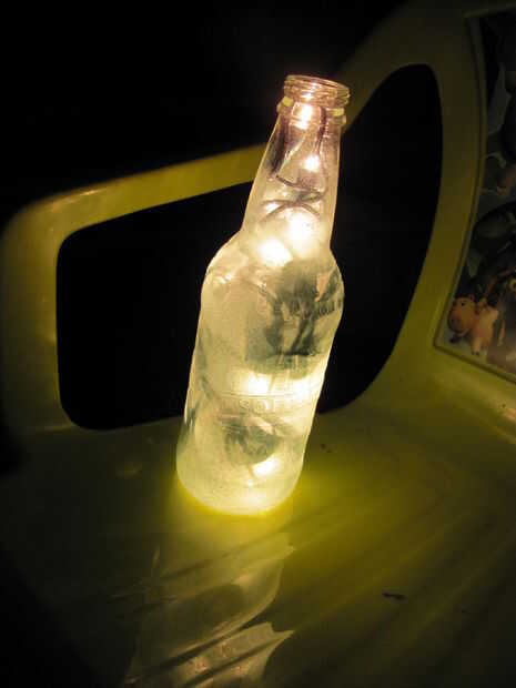 Ninguna obra de botella de vidrio, recuerde el más grande es la botella, más luces que necesita.  Hice un enorme de una botella de vodka bar tierno amigo me dio, que he usado luces de Halloween naranja (75% de descuento después de la venta de vacaciones).  Y botellas más pequeñas son grandes con los pequeños filamentos que son pilas, ideal para escritorios.