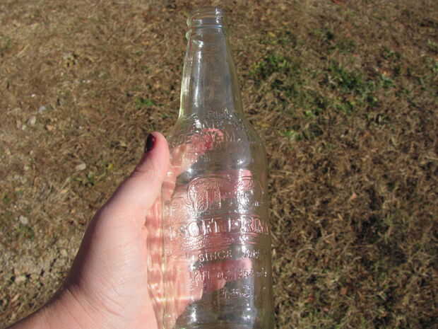 utilicé una botella de A & W Soda de crema.  Estoy haciendo esto para mi sobrino y los que he visto hechos de botellas de vino se parecían un poco inadecuados, incluso con la etiqueta quitada.  Limpie la botella y asegúrese de que se seque completamente antes de empezar.  Si hay agua en él, el polvo queda pegado a él y es difícil de lavar.