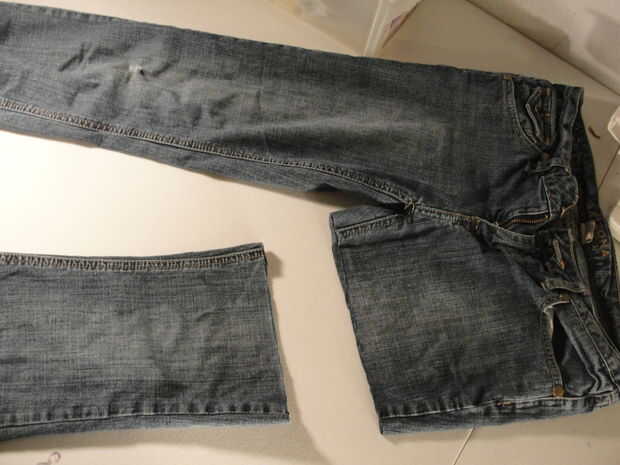 Luego quitarse los pantalones (poner en otra cosa por supuesto!) y colocar sobre una superficie plana. Toma tus tijeras y corte las marcas muy recta a través de. Ahora tienes un par de jeans con una pierna atado y la otra flotando en algún lugar.