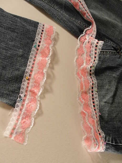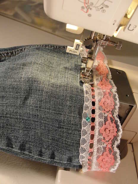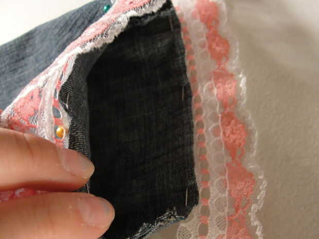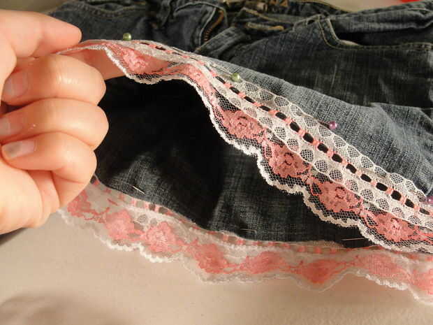 Ahora que usted ha expuesto los bordes, necesita cubrir para arriba con algo bastante. Toma tu cinta bonita y pin en los bordes. La cinta de opciones sólo tiene que sentarse en la parte superior del borde pero lo suficiente como para que no puede ver los bordes deshilachados. Los pasadores de sujetarlo mientras se cose en el. Utilice el ajuste de zig-zag en la máquina de coser para mantener el robusto de la cinta.
