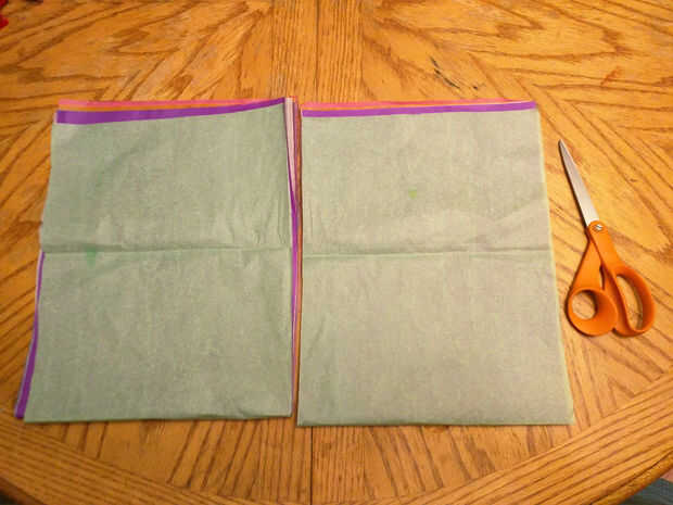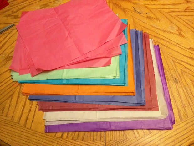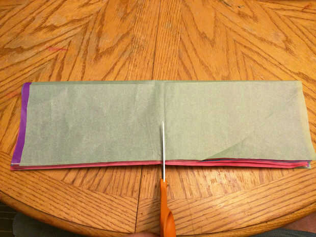 I elegir 8 pedazos de papel de seda, los apilados juntos y les dobla por la mitad y mitad otra vez cortan la pila a la mitad, luego tomó las 2 pilas pequeñas y cortarlas por la mitad otra vez, me da 4 pilas de 8 cada uno de los 8 colores.