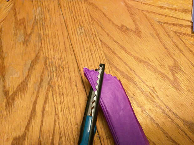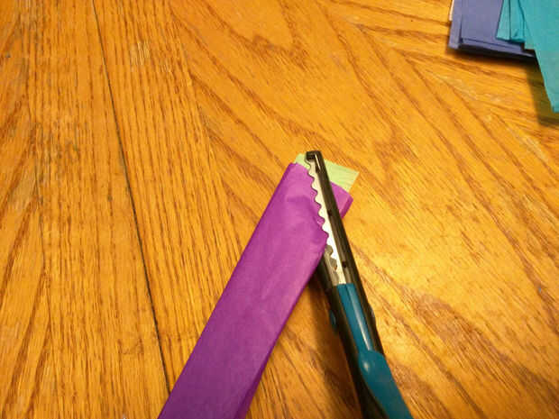 Ahora corte las esquinas redondeadas a través de todas las capas en cada extremo largo. Usted podría también puntos de corte. Oh, y hacerlo en un bote de basura o algo así, porque se pone muy