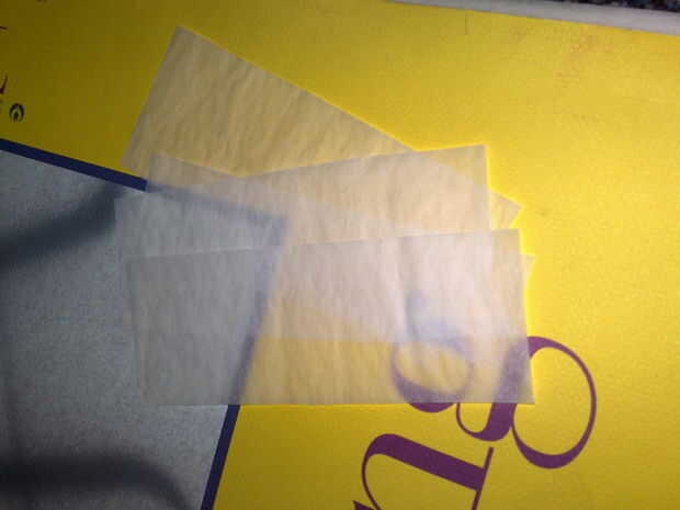 Ahora toma su papel de calco, tejido y trocear en tiras manejables.  Hice mío sobre la longitud que quería la sombra hasta cerca de 5 pulgadas de largo y 2 pulgadas de ancho, pero puede hacer lo que sea cómodo para la sombra de tamaño que está trabajando.  Si dejas demasiado grande no ponen planas alrededor de las curvas.