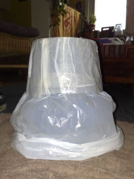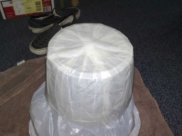 Coloque las tiras en el formulario (es decir, bote de basura) de todos modos que desee.  Puede ser creativo y hacer el diseño simplemente fuera de los ángulos que se crean mientras se aplica esta primera capa de papel de seda.  Prefiero el color por lo que solo se aplica hacia abajo en los lados y entrecruzamiento en la parte superior (para el refuerzo adicional).
