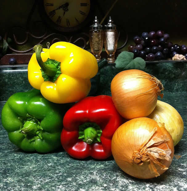 Tres pimientos, no demasiado grandes, no demasiado poco. Amarillo, rojo y verde.