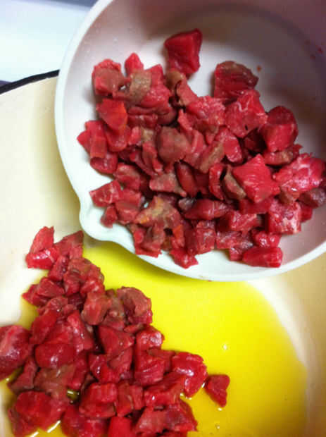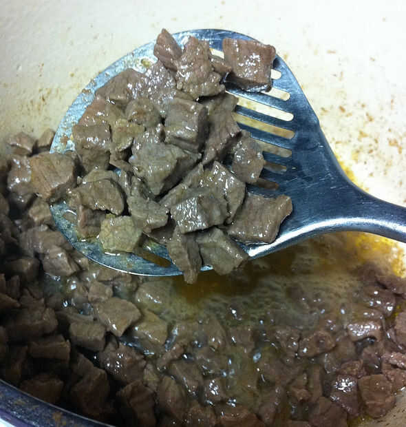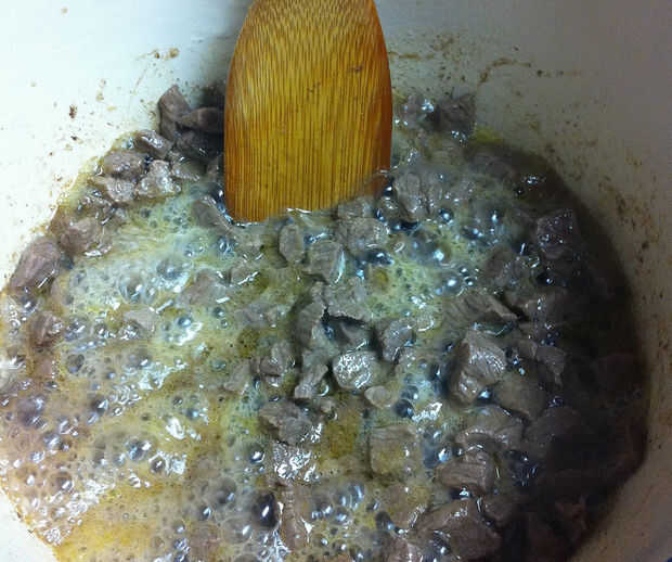calentar el aceite de oliva a fuego medio y dorar la carne de guiso por todos lados.
