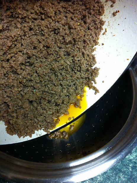 Cuando se cocina la hamburguesa y salchicha, viértala en un filtro o colador