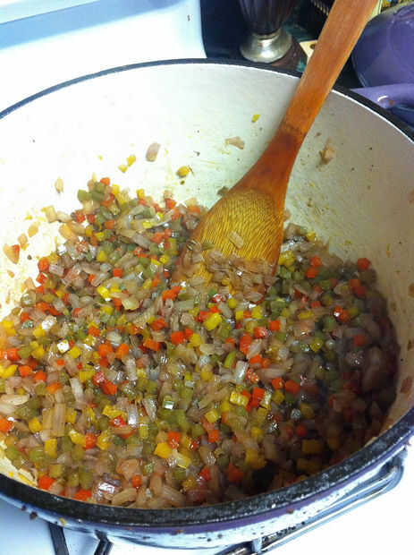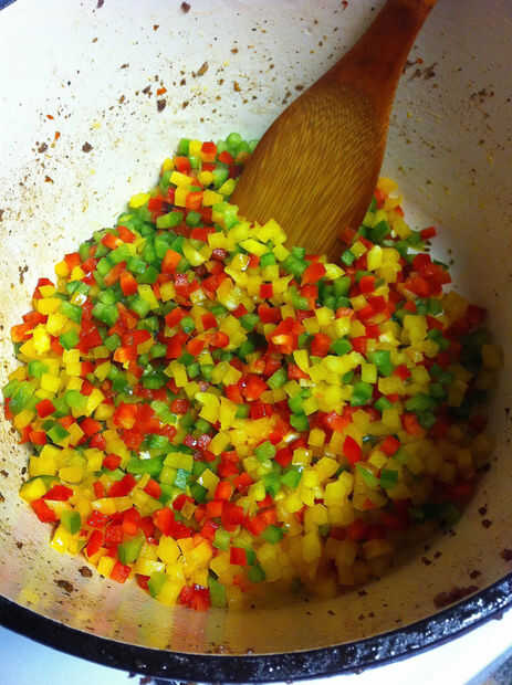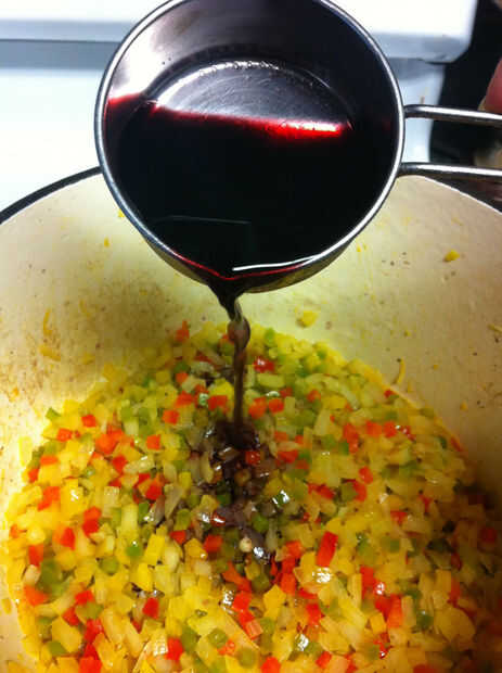 Paso 6: Saltear los pimientos y las cebollas, añadir el vino, reducir...