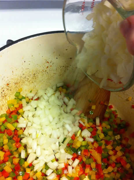 Añadir las cebollas y los pimientos y saltear a fuego medio durante unos cinco minutos.