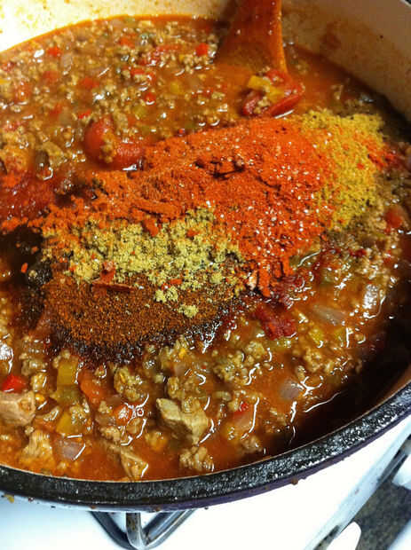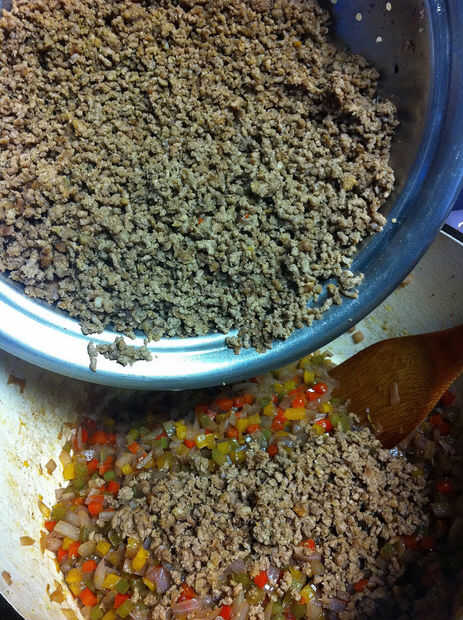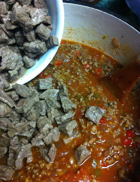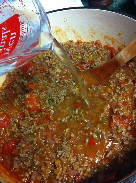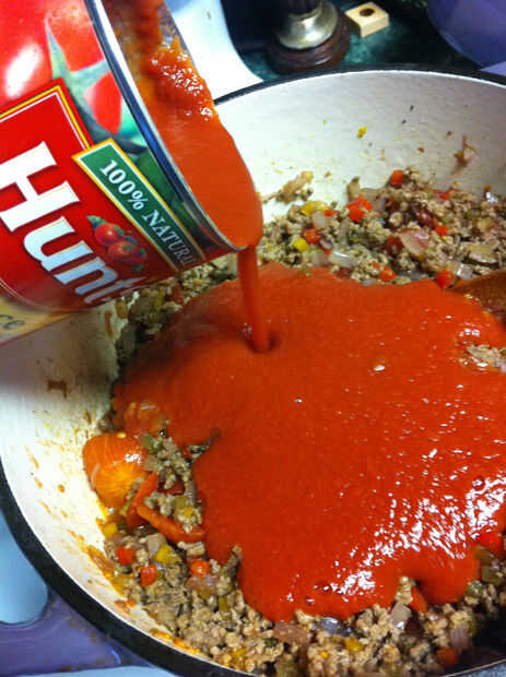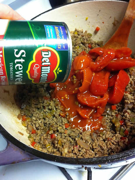 Agregar el guiso de carne, estofados tomates, salsa de tomate.