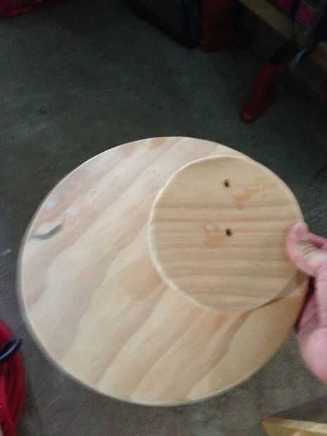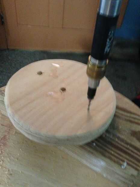 Perfore un orificio de 3/32" directamente a través del centro de ambos discos.  En el disco pequeño, perfore cuatro agujeros de 3/32" en forma de T-, aproximadamente 1 a 1-1/2" de los bordes.  A continuación, en el disco pequeños, utilice la broca cuidadosamente