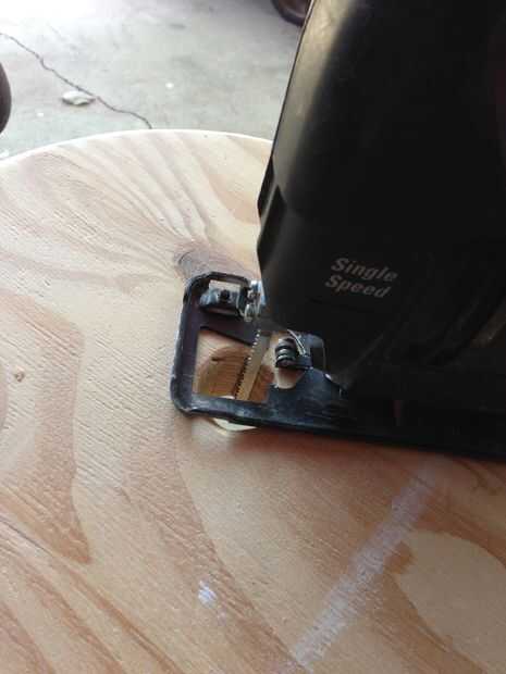 Utilice el compás para marcar el centro de ambos lados del asiento con un círculo de 1-1/8"(dimensión externa del acoplador del PVC). Utiliza una broca grande y entonces se utiliza la Sierra de vaivén - corte en pequeños cortes alrededor del perímetro del círculo. No necesita ser un círculo de corte liso. De hecho ayuda la aspereza en el pegado del acoplador de PVC insertado (siguiente paso).