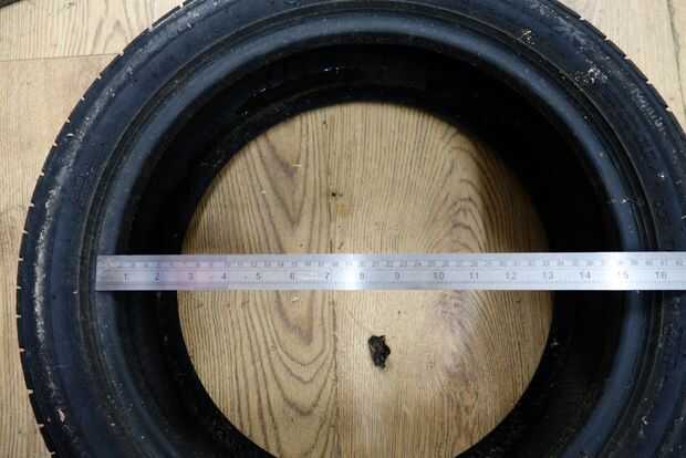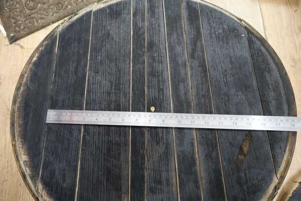 Comience midiendo el diámetro de la vuelta que necesita de su neumático. Este es el interior diámetro de neumático más lo suficiente para que la madera ronda se sienta cómodamente en la parte superior del neumático. Corresponde más o menos el tamaño impreso en el neumático más 1". Se utilizó un neumático 175/50R15 . Así que cortamos los extremos de la barrica en rondas de 16". Es de aproximadamente 41 cm.