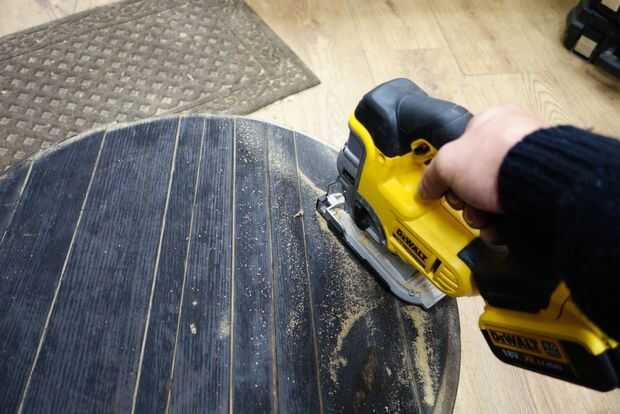 Un pequeño tornillo parcialmente en el centro que han establecido. Hacer un lazo con un trozo de cuerda (paracord es ideal). Pasar el tornillo del centro a un lado y una pluma en el otro. Cuando se tira el lazo apretado con el lápiz, su longitud debe ser exactamente la mitad del diámetro de la ronda que necesita. Dibujar este círculo a la madera.