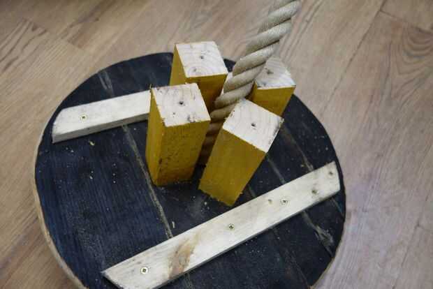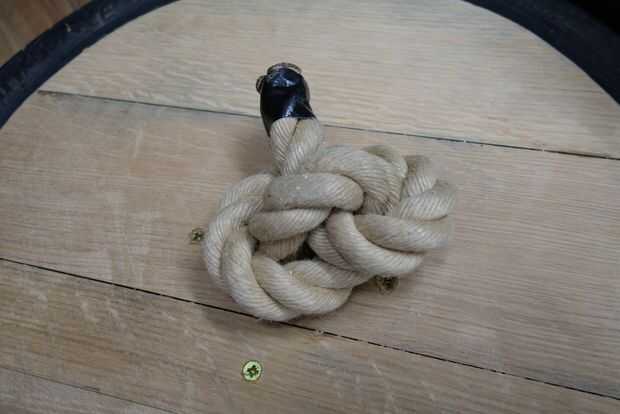 Pasar la cuerda a través de esta redonda y lazo apagado debajo con un nudo figura de ocho y tire el nudo apretado en la parte inferior de la ronda. Pase el extremo largo de la cuerda a través de la rueda, luego a través del orificio del centro en el redondo de madera superior (Asegúrese de que enfrenta la forma correcta). Presione los cuatro restantes tornillos largos completamente a través de los orificios pretaladrados en el redondo de madera superior, para que sobresalgan por la parte inferior. Alinee los tornillos con el centro de los postes de madera. Si no has atornillado la parte inferior en demasiado apretado, usted puede todavía meneo les alrededor un poco a la línea hasta con los tornillos. Empuje hacia abajo en cada tornillo cuando está en el centro de un poste de madera, así que pica en la madera. Cuando los cuatro tornillos están colocados correctamente, atornillarlas y apriete más cada uno a su vez como vas. Vuelta el neumático y vuelva a apretar los tornillos de la parte inferior. Hacer esto otra vez para arriba y otra vez para la parte inferior hasta que todos los tornillos estén apretados.
