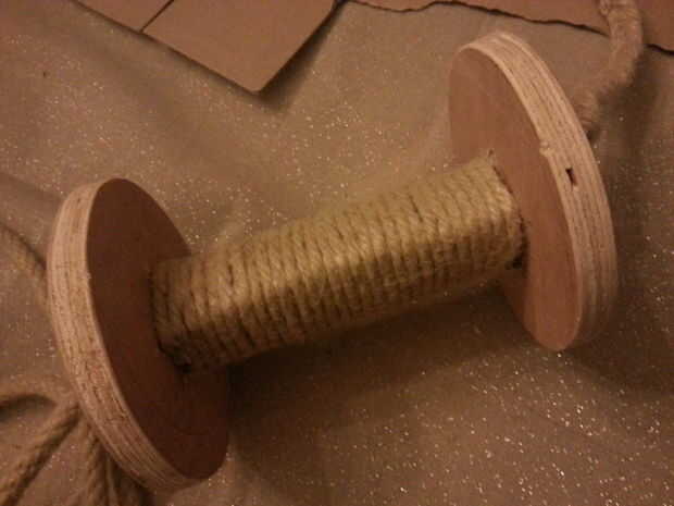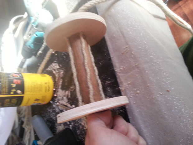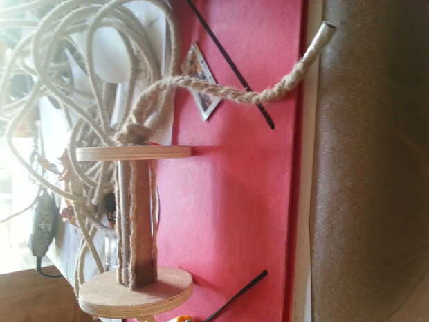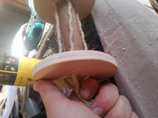 Tienes que ver 2 piezas iguales de círculo de diámetro de 12cm que tienes taladro 4 agujeros en cada pieza. El pedazo de escoba debe ser tan largo como la altura de la elipse. Ahora usted necesita poner un nudo en la cuerda a unos 50cm y luego desenredar la cuerda. Los 2 círculos y el pedazo de escoba están conectados con un tornillo en el centro. Desentraña tirar del cable puede ser cierto los 4 agujeros en los círculos. En la parte inferior he trenzado de la cuerda detrás juntos y poner un nudo en él contra el círculo de la parte inferior. He trenzar la cuerda alrededor de la escoba para que las cuerdas desentraña están bloqueadas en su lugar.