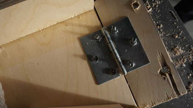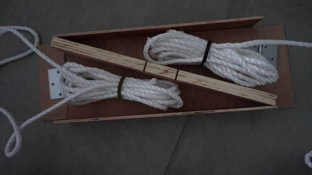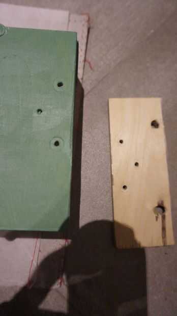 -Ahora hacen en dos piezas cortas de madera, 2 agujeros cada una para fijar la cuerda. Y también los agujeros para colocar las bisagras. Fije las bisagras a la madera a través de las tuercas y los pernos.
