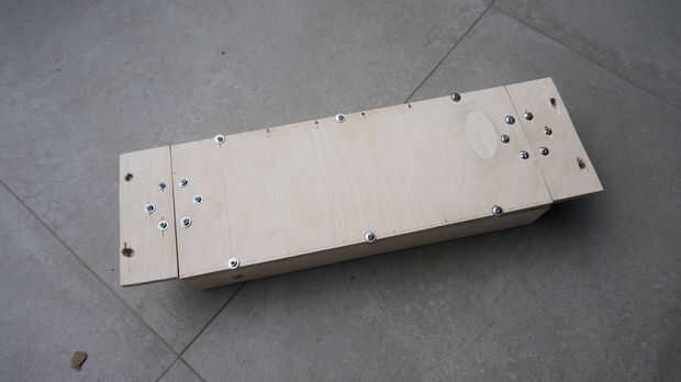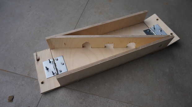-Luego unir todas las piezas para que obtener una caja abierta que pueden desplegar las dos partes cortas. Reforzar el columpio por unos tornillos (3 de cada tamaño) en la parte fija para convertir estas piezas más firmemente. Esto va a ser el columpio.